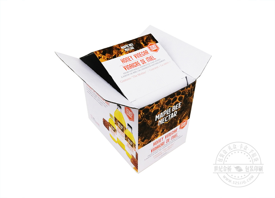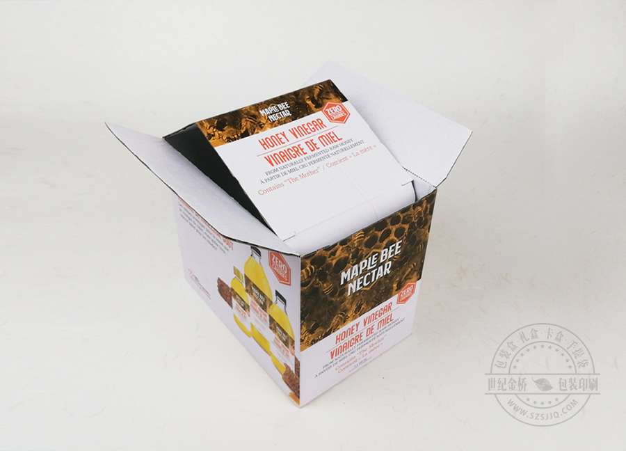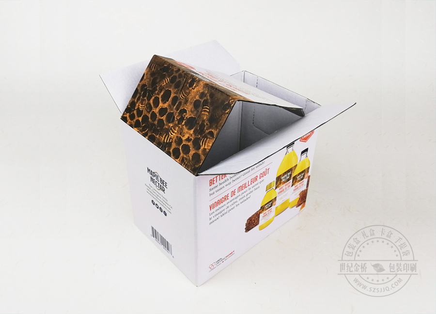 这是一款出口的蜂蜜土特产瓦楞纸盒包装,展开可以平铺,对于外贸货运来说,有巨大的物流优势,坑纸外裱单面灰板,冲型便会成型,材料和加工都较为简单,做大件商品的包装盒较为合适。